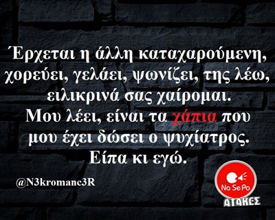 καταχαρούμενη, χορεύει, γελάει, ψωνίζει, της λέω, ειλικρινά σας χαίρομαι. Μου λέει, είναι τα χάπια που μου έχει δώσει ο ψυχίατρος. Είπα κι εγώ. @N3kromanc3R