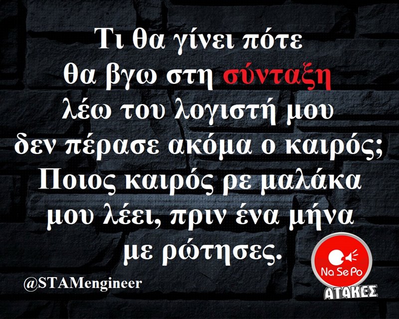 Τι θα γίνει πότε θα βγω στη σύνταξη λέω του λογιστή μου δεν πέρασε ακόμα ο καιρός; Ποιος καιρός ρε μαλάκα μου λέει, πριν ένα μήνα με ρώτησες. @STAMengineer