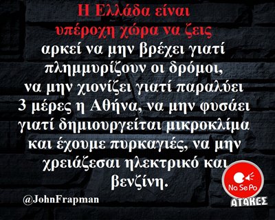 Ελλάδα είναι υπέροχη χώρα να ζεις αρκεί να μην βρέχει γιατί πλημμυρίζουν οι δρόμοι, να μην χιονίζει γιατί παραλύει 3 μέρες η Αθήνα, να μην φυσάει γιατί δημιουργείται μικροκλίμα και έχουμε πυρκαγιές, να μην χρειάζεσαι ηλεκτρικό και βενζίνη. @JohnFrapman