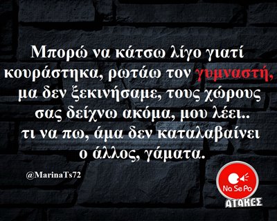 λίγο γιατί κουράστηκα, ρωτάω τον γυμναστή, μα δεν ξεκινήσαμε, τους χώρους σας δείχνω ακόμα, μου λέει.. τι να πω, άμα δεν καταλαβαίνει ο άλλος, γάματα. @MarinaTs72