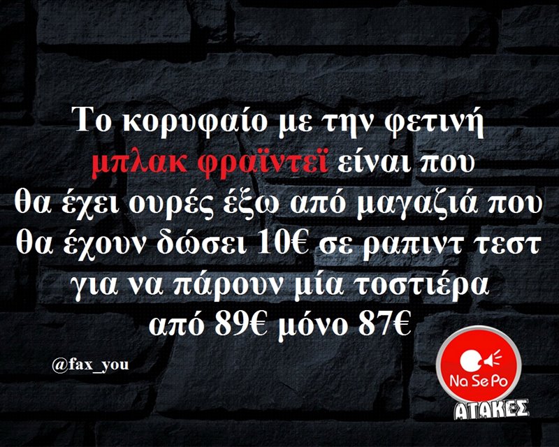 την φετινή μπλακ φταϊντεί είναι που θα έχει ουρές έξω από μαγαζιά που θα έχουν δώσει 10€ σε ραπιντ τεστ για να πάρουν μία τοστιέρα από 89€ μόνο 87€ @fax_you