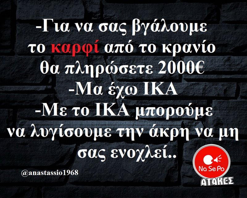 βγάλουμε το καρφί από το κρανίο θα πληρώσετε 2000€ -Μα έχω ΙΚΑ -Με το ΙΚΑ μπορούμε να λυγίσουμε την άκρη να μη σας ενοχλεί.. @anastassio1968