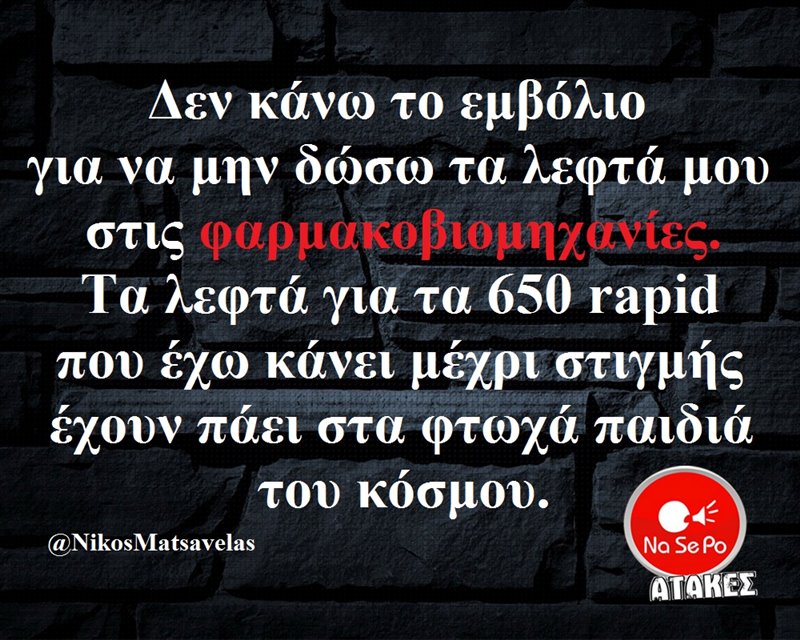 εμβόλιο για να μην δώσω τα λεφτά μου στις φαρμακοβιομηχανίες. Τα λεφτά για τα 650 rapid που έχω κάνει μέχρι στιγμής έχουν πάει στα φτωχά παιδιά του κόσμου. @NikosMatsavelas