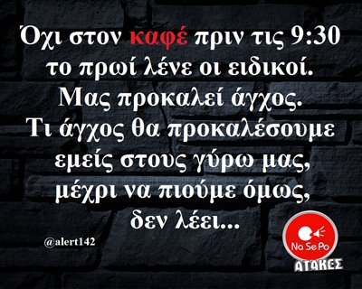 Όχι στον καφέ πριν τις 9:30 το πρωί λένε οι ειδικοί. Μας προκαλεί άγχος. Τι άγχος θα προκαλέσουμε εμείς στους γύρω μας, μέχρι να πιούμε όμως, δεν λέει... @alert142