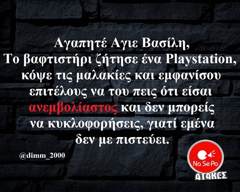 Βασίλη. Το βαφτιστήρι ζήτσε ένα Playstation, κόψε της μαλακίες και εμφανίσου επιτέλους να τους πεις ότι είσαι