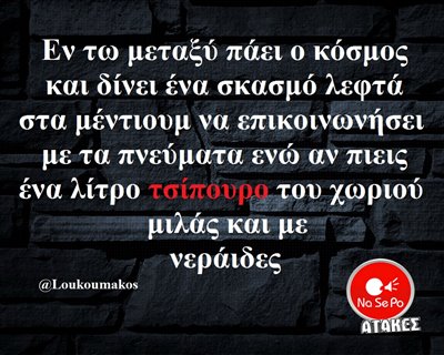 ο κόσμος και δίνει ένα σκασμό λεφτά στα μέντιουμε να επικοινωνήσει με τα πνεύματα ενώ αν πιεις ένα λίτρο τσίπουρο του χωριού μιλάς και με νεράιδες @Loukoumakos