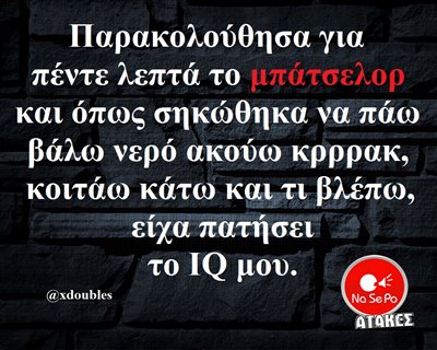 Παρακολούθησα για πέντε λεπτά το μπάτσελορ και όπως σηκώθηκα να πάω βάλω νερό ακούω κρρρακ, κοιτάω κα΄τω και τι βλέπω, είχα πατήσει το IQ μου. @xdoubles