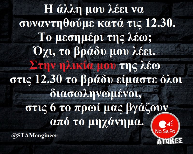 να συναντηθούμε κατά τις 12.30. Το μεσημέρι της λέω; Όχι, το βράδυ μου λέει.