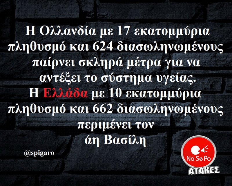 εκατομμύρια πληθυσμό και 624 διασωληνωμένους παίρνει σκληρά μέτρα για να αντέξει το σύστημα υγείας. Η Ελλάδα με 10 εκατομμύρια πληθυσμό και 662 διασωληνωμένους περιμένει τον άη Βασίλη @spigaro