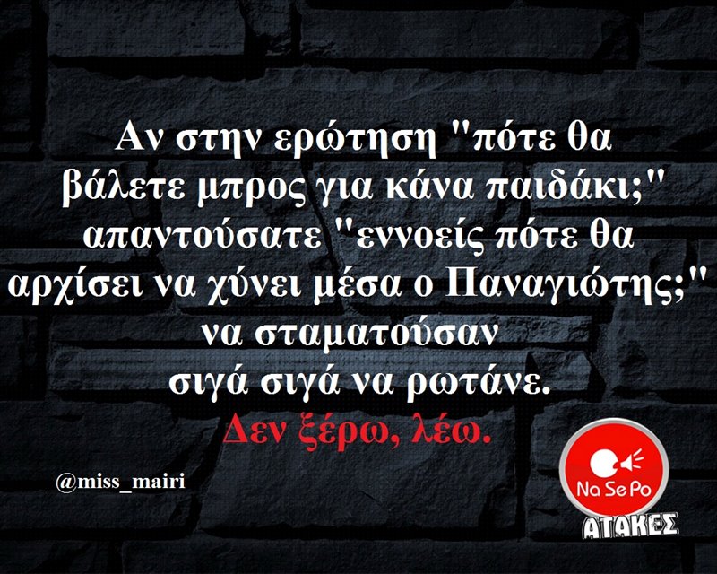 θα βάλετε μπρος για κάνα παιδάκι;” απαντούσατε “εννοείς πότε θα αρχίσει να χύνει μέσα ο Παναγιώτης;” να σταματούσαν σιγά σιγά να ρωτάνε.