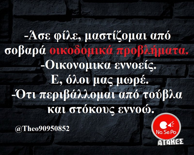 μαστίζομαι από σοβαρά οικοδομικά προβλήματα. -Οικονομικά εννοείς. Ε, όλοι μας μωρέ. -Ότι περιβάλλομαι από τούβλα και στόκους εννοώ. @Theo90950852