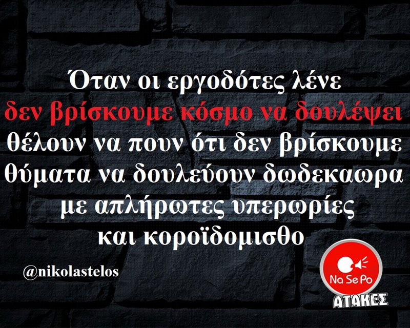 λένε δεν βρίσκουμε κόσμο να δουλέψει θέλουν να πουν ότι δεν βρίσκουμε θύματα να δουλεύουν δωδεκάωρα με απλήρωτες υπερωρίες και κοροϊδομισθο @nikolastelos