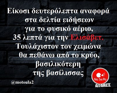 Είκοσι δευτερόλεπτα αναφορά στα δελτία ειδήσεων για το φυσικό αέριο, 35 λεπτά για την Ελισάβετ. Τουλάχιστον τον χειμώνα θα πεθάνω από το κρύο, βασιλικότερη της βασίλισσας @motoula2
