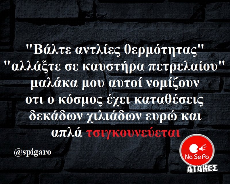 θερμότητας” “αλλάξτε σε καυστήρα πετρελαίου” μαλάκα μου αυτοί νομίζουν ότι ο κόσμος έχει καταθέσεις δεκάδων χιλιάδων ευρώ και απλά τσιγκουνεύεται @spigaro