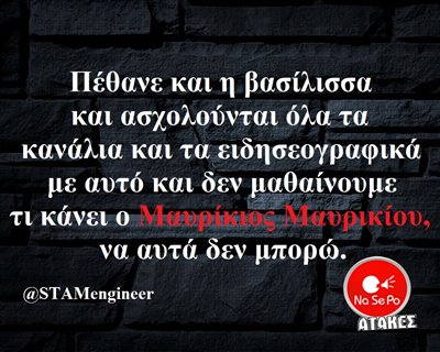 βασίλισσα και ασχολούνται όλα τα κανάλια και τα ειδησεογραφικά με αυτό και δεν μαθαίνουμε τι κάνει ο Μαυρίκιος Μαυρικίου να αυτά δεν μπορώ. @STAMengineer