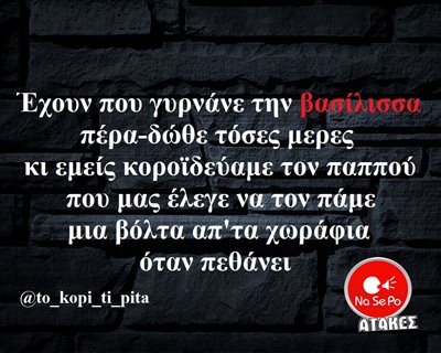 την βασίλισσα πέρα-δώθε τόσες μέρες κι εμείς κοροϊδεύαμε τον παππο΄τ που μας έλεγε να τον πάμε μια βόλτα απ’τα χωράδια όταν πεθάνει @to_kopi_ti_pita