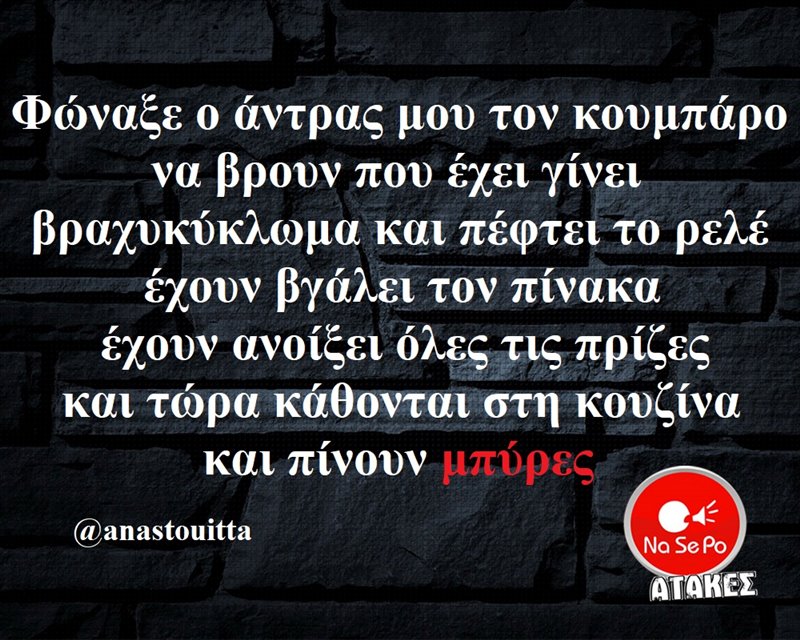 μου τον κουμπάρο να βρουν που έχει γίνει βραχυκύκλωμα και πέφτει το ρελέ έχουν βγάλει τον πίνακα έχουν ανοίξει όλες τις πρίζες και τώρα κάθονται στη κουζίνα και πίνουν μπύρες @anastouitta