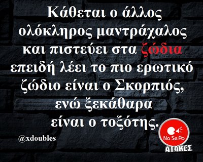 Κάθεται ο άλλος ολόκληρος μαντράχαλος και πιστεύει στα ζώδια επειδή λέει το πιο ερωτικό ζώδιο είναι ο Σκορπιός, ενώ ξεκάθαρα είναι ο τοξότης. @xdoubles