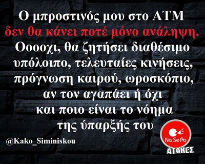 στο ΑΤΜ δεν θα κάνει ποτέ μόνο ανάληψη. Όοοοχι, θα ζητήσει διαθέσιμο υπόλοιπο, τελεταίες κινήσεις, πρόγνωση καιρού, ωροσκόπιο, αν τον αγαπάει ή όχι και ποιο είναι το νόημα της ύπαρξής του @Kako_siminiskou