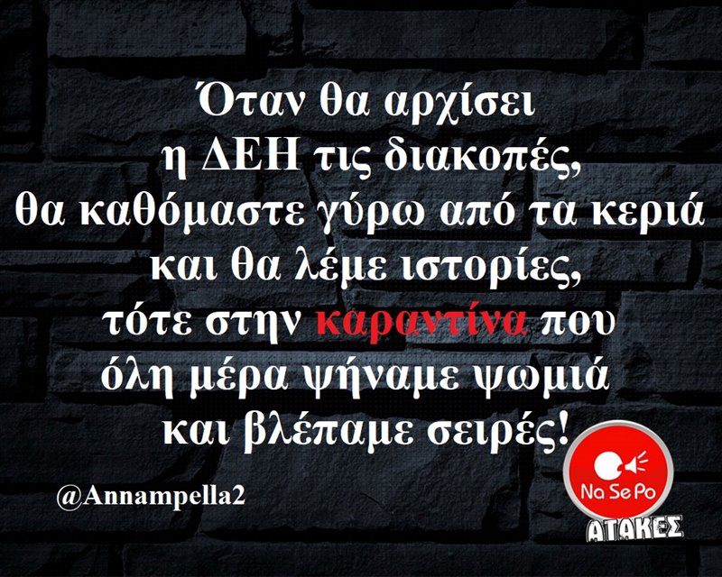 Όταν θα αρχίσει η ΔΕΗ τις διακοπές, θα καθόμαστε γύρω από τα κεριά και θα λέμε ιστορίες, τότε στην καραντίνα που όλη μέρα ψήναμε ψωμιά και βλέπαμε σειρές! @Annampella2