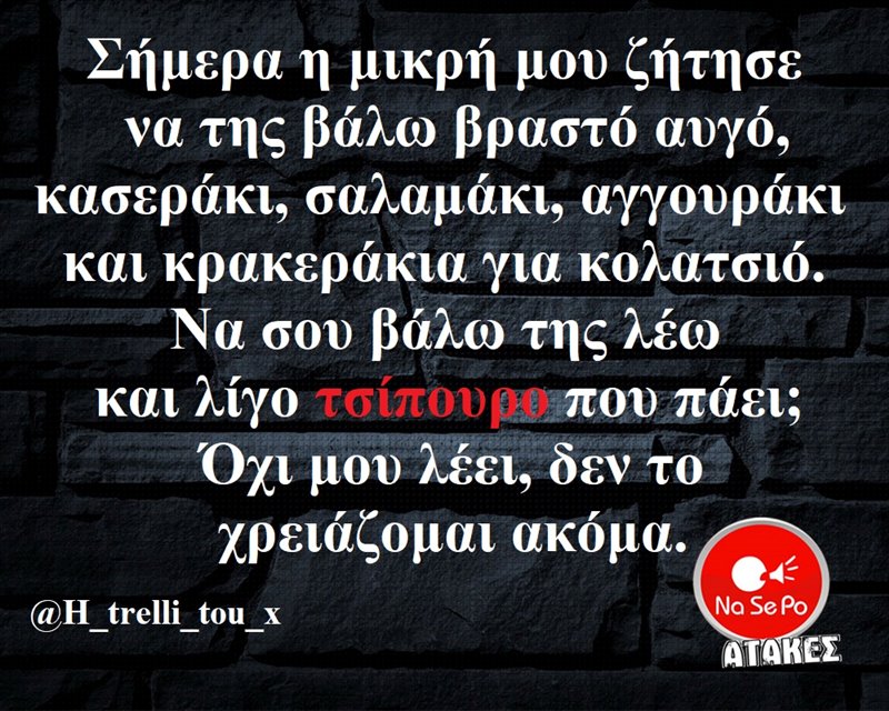 μου ζήτησε να της βάλω βραστό αυγό, κασεράκι, σαλαμάκι, αγγουράκι και κρακεράκια για κολατσιό. Να σου βάλω βάλω της λέω και λίγο τσίπουρο που πάει; Όχι μου λέει, δεν το χρειάζομαι ακόμα. @H_trelli_tou_x