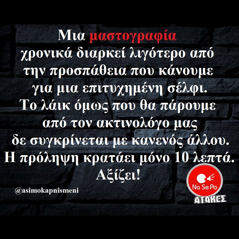 Μια μαστογραφία χρονικά διαρκει λιγότερο από την προσπάθεια που κάνουμε για μια επιτυχημένη σέλφι. Το λάικ όμως που θα πάρουμε από τον ακτινολόγο μας δε συγκρίνεται με κανενός άλλου. Η πρόληψη κρατάει μόνο 10 λεπτά. Αξίζει! @asimokapnismeni