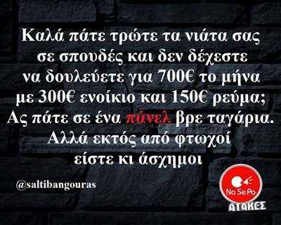 Καλά πάτε τρώτε τα νιάτα σας σε σπουδές και δεν δέχεστε να δουλεύετε για 700€ το μήνα με 300€ ενοίκιο και 150€ ρεύμα; Ας πάτε σε ένα πάνελ βρε ταγάρια. Αλλά εκτός από φτωχοί είστε κι άσχημοι @saltibangouras