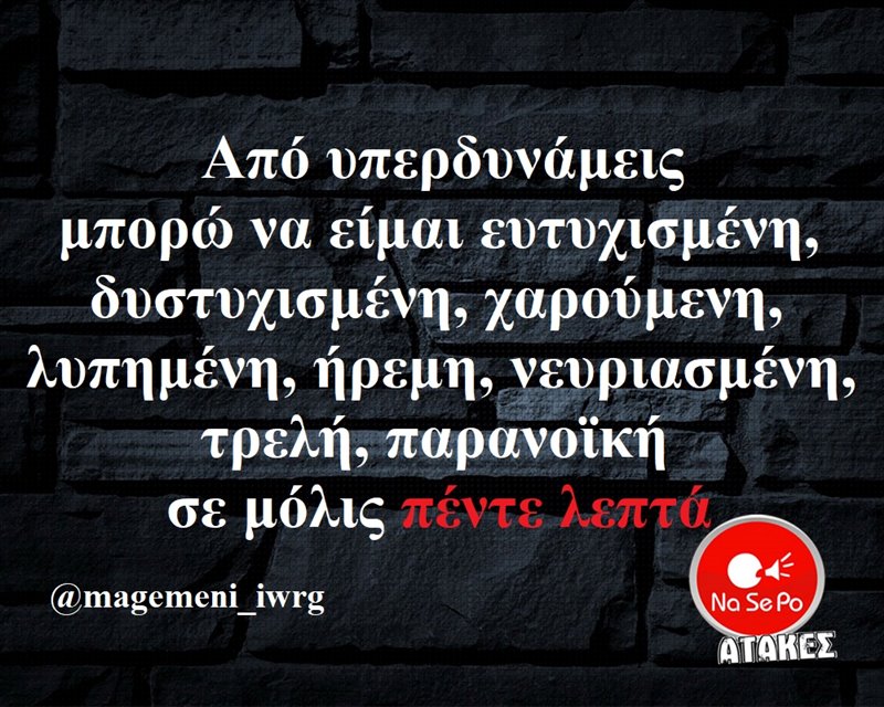 Από υπερδυνάμεις μπορώ να είμαι ευτυχισμένη, δυστυχισμένη, χαρούμενη, λυπημένη, ήρεμη, νευριασμένη, τρελή, παρανοϊκή σε μόλις πέντε λεπτά @magemeni_iwrg