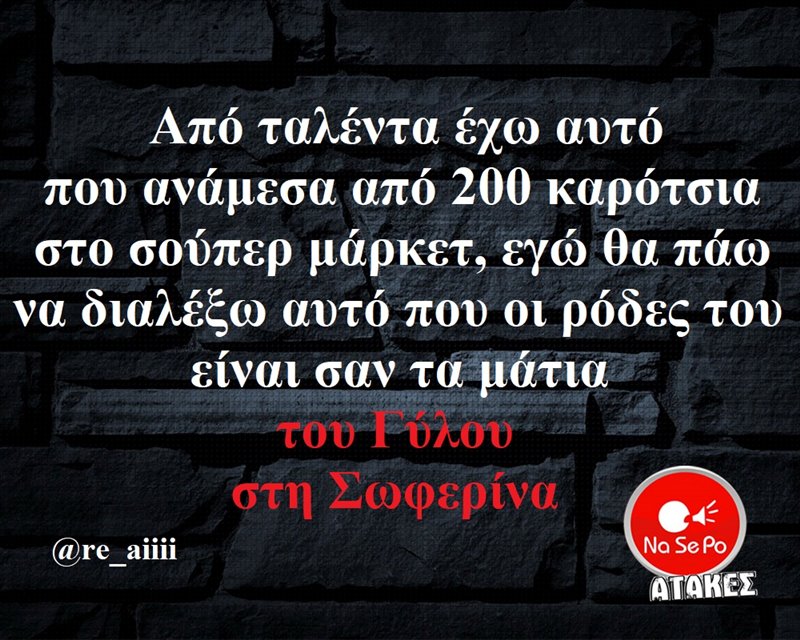 Από ταλέντα έχω αυτό που ανάμεσα από 200 καρότσια στο σούπερ μάρκετ, εγώ θα πάω να διαλέξω αυτό που οι ρόδες του είναι σαν τα μάτια του Γύλου στη Σωφερίνα @re_aiiii