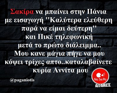 Σακίρα να μπαίνει στην Πάνια με εισαγωγή "Καλύτερα ελεύθερη παρά να είμαι δεύτερη" και Πικέ τηλεφωνική μετά το πρώτο διάλειμμα.. Μου κανε μάγια πήγε να μου κόψει τρίχες απτο..καταλαβαίνετε κυρία Αννίτα μου @paganiotis