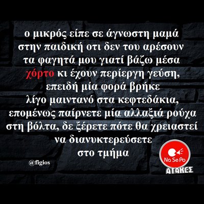 Ο μικρός είπε σε άγνωστη μαμά στην παιδική οτι δεν του αρέσουν τα φαγητά μου γιατί βάζω μέσα χόρτο κι έχουν περίεργη γεύση, επειδή μία φορά βρήκε λίγο μαιντανό στα κεφτεδάκια, επομένως παίρνετε μία αλλαξιά ρούχα στη βόλτα, δε ξέρετε πότε θα χρειαστεί να διανυκτερεύσετε στο τμήμα @figios