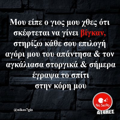 Μου είπε ο γιος μου χθες ότι σκέφτεται να γίνει βίγκαν, στηρίζω κάθε σου επιλογή αγόρι μου του απάντησα & τον αγκάλιασα στοργικά & σήμερα έγραψα το σπίτι στην κόρη μου @nikos7gio