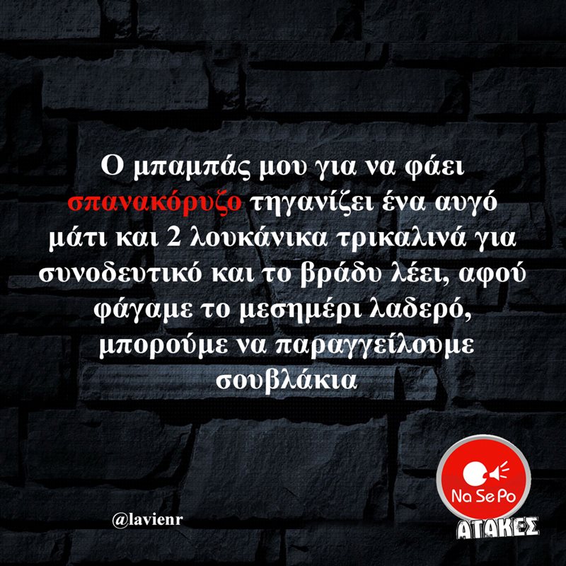 Ο μπαμπάς μου για να φάει σπανακόρυζο τηγανίζει ένα αυγό μάτι και 2 λουκάνικα τρικαλινά για συνοδευτικό και το βράδυ λέει, αφού φάγαμε το μεσημέρι λαδερό, μπορούμε να παραγγείλουμε σουβλάκια @lavienr