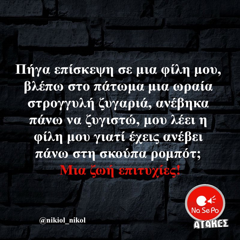 Πήγα επίσκεψη σε μια φίλη μου, βλέπω στο πάτωμα μια ωραία στρογγυλή ζυγαριά, ανέβηκα πάνω να ζυγιστώ, μου λέει η φίλη μου γιατί έχεις ανέβει πάνω στη σκούπα ρομπότ; Μια ζωή επιτυχίες! @nikiol_nikol