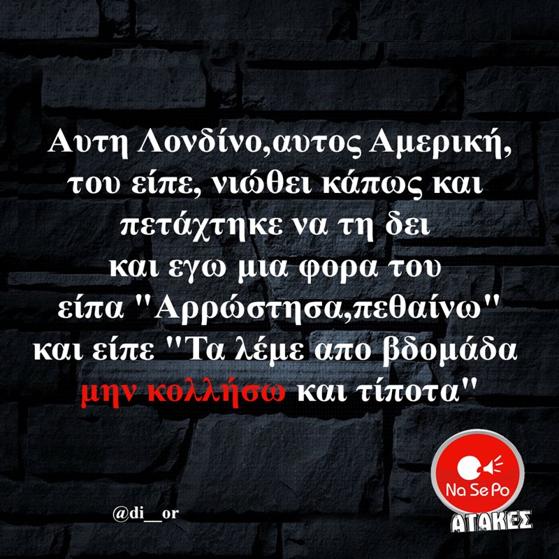 Αυτή Λονδίνο, αυτός Αμερική, του είπε, νιώθει κάπως και πετάχτηκε να τη δει και εγώ μια φορά του είπα "Αρρώστησα,πεθαίνω" και είπε "Τα λέμε απο βδομάδα μην κολλήσω και τίποτα" @di__or
