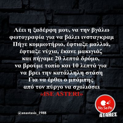 Λέει η ξαδέρφη μου, να την βγάλω φωτογραφία για να βάλει ινσταγκραμ Πήγε κομμωτήριο, έφτιαξε μαλλιά, έφτιαξε νύχια, έκανε μακιγιάζ και πήγαμε 20 λεπτά δρόμο, να βρούμε τοπίο και 10 λεπτά για να βρει την κατάλληλη στάση Για να έρθει ο μπάμπης από τον πύργο να σχολιάσει «ISE ASTERI» @anastasis_1988