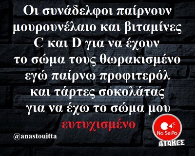 Οι συνάδελφοι παίρνουν μουρουνέλαιο και βιταμίνες C και D για να έχουν το σώμα τους θωρακισμένο εγώ παίρνω προφιτερόλ και τάρτες σοκολάτας για να έχω το σώμα μου ευτυχισμένο @anastouitta