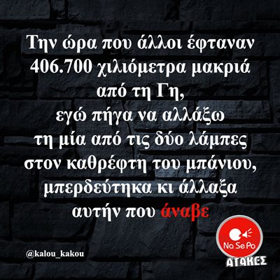 Την ώρα που άλλοι έφταναν 406.700 χιλιόμετρα μακριά από τη Γη, εγώ πήγα να αλλάξω τη μία από τις δύο λάμπες στον καθρέφτη του μπάνιου, μπερδεύτηκα κι άλλαξα αυτήν που άναβε @kalou_kakou