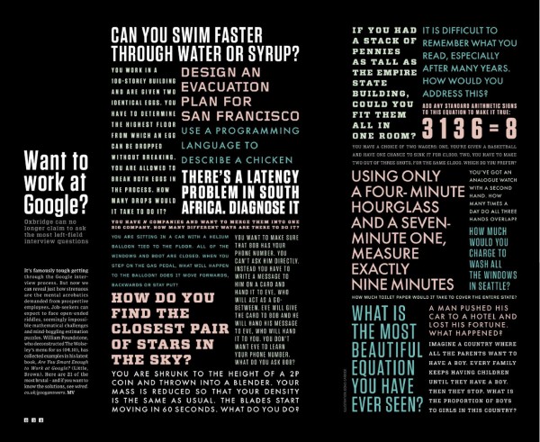 Όπως αναφέρει το βιβλίο του William Poundstone “Are You Smart Enough to Work at Google?” αν ενδιαφέρεστε να υποβάλετε το βιογραφικό σας στον διαδικτυακό κολοσσό θα πρέπει να είστε προετοιμασμένοι για ερωτήσεις του τύπου “Ποια είναι η πιο όμορφη εξίσωση που έχεις δει” ή “Φτιάξε μου ένα σχέδιο εκκένωσης του Σαν Φρανσίσκο”.