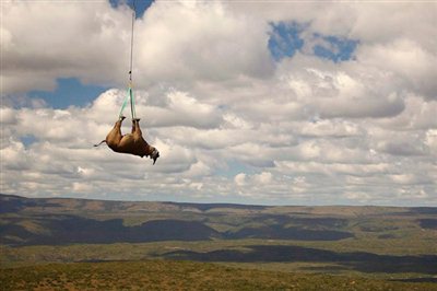 Ένας αναισθητοποιημένος μαύρος ρινόκερος μεταφέρεται με στρατιωτικό ελικόπτερο, από τους του Ανατολικού Ακρωτηρίου της Νοτίου Αφρικής στο καινούργιο του σπίτι, 15 μίλια πιο μακριά. (Green Renaissance / EPA)