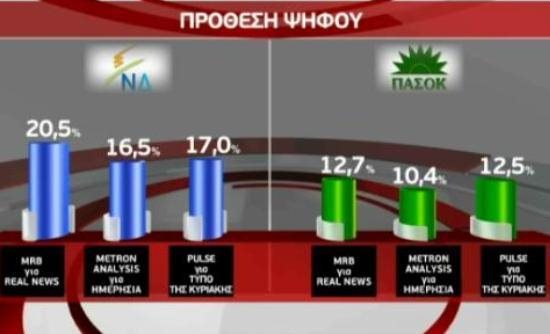 Το ρευστό πολιτικό κλίμα και η πτώση των δύο μεγάλων κομμάτων επιβεβαιώνεται σε τρεις νέες δημοσκοπήσεις. Σύμφωνα με την MRB για την Realnews η διαφορά της ΝΔ με το ΠΑΣΟΚ φτάνει στο 7,8%, η εταιρεία pulse για τον Ελεύθερο Τύπο της Κυριακής δίνει την διαφορά στο 6% και η Μέτρον Analysis για την Ημερησία στο 4,5%.