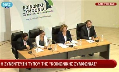 Έγινε και αυτό. Ο εκπρόσωπος της «Κοινωνικής Συμφωνίας» κατά την έναρξη της διακαναλικής συνέντευξης τύπου και παρουσιάζοντας τα στελέχη που ήταν στο πάνελ μπέρδεψε το όνομα του κόμματος και το είπε...«Κοινωνική Συμμαχία» για να τον διορθώσει η Πρόεδρος Λούκα Κατσέλη.