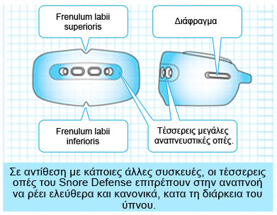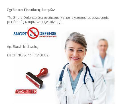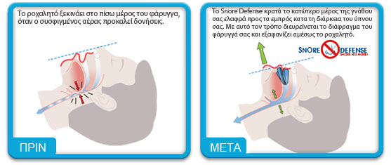 Το ροχαλητό οφείλεται στις δονήσεις των ιστών στο πίσω μέρος του φάρυγγα. То Snore Defense χρησιμοποιεί τις ίδιες μεθόδους, τις οποίες χρησιμοποιούν εδώ και 20 χρόνια οι γιατροί για τη θεραπεία του ροχαλητού. Το Snore Defense είναι κατασκευασμένο για να δουλεύει χωρίς καμία ρύθμιση και χωρίς δαπανηρές επισκέψεις σε γιατρούς. Και για τη δική σας ηρεμία, το Snore Defense έχει άδεια από το FDA (FOOD and DRUG ASSOCIATION) για την αντιμετώπιση του ροχαλητού – γι' αυτό μπορείτε να είστε σίγουροι για την ασφάλεια και αποτελεσματικότητά του.