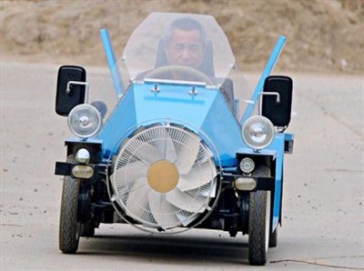 Τώρα έφτασε η σειρά του αυτοκινήτου που θα χρησιμοποιεί ως καύσιμο για να κινηθεί τον αέρα. Ενας 55χρονος αγρότης από την Κίνα κατασκεύασε ένα όχημα το οποίο βασίζευται κυρίως σε έναν τεράστιο ανεμιστήρα που βρίσκεται στο μπροστινό μέρος και με τη βοήθεια μιας ανεμογεννήτριας παράγει ηλεκτρισμό και μπορεί να διανύσει 138 χιλιόμετρα. Το κόστος κατασκευής του δεν ξεπέρασε τα 1.500 δολάρια.