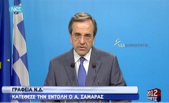 Σκληρή ήταν η απάντηση που έδωσε ο πρόεδρος της ΝΔ στο τελεσίγραφο του Αλέξη Τσίπρα, ο οποίος τον κάλεσε να αποσύρει με νέα επιστολή του στους ηγέτες της Ε.Ε. την υπογραφή του από την εφαρμογή του Μνημονίου και της δανειακής σύμβασης. Ολόκληρη η δήλωση του Αντώνη Σαμαρά: «Η Νέα Δημοκρατία είχε προειδοποιήσει για το ενδεχόμενο ακυβερνησίας και κάνουμε ό,τι είναι δυνατό για να προκύψει κυβέρνηση. Είχαμε προειδοποιήσει, ακόμα, ότι υπάρχει κίνδυνος από επικίνδυνους πειραματισμούς, σε μια φάση που η χώρα έχει φτάσει στα όριά της. Γιατί η χώρα δεν αντέχει παιγνίδια με τη φωτιά…Είμαστε έτοιμοι, με κάθε καλή πρόθεση, να δώσουμε την ανοχή μας σε κυβέρνηση μειοψηφίας - στην οποία εμείς δεν θα μετέχουμε - εφ’ όσον, βεβαίως, διασφαλίζει την παραμονή της χώρας στο ευρώ και τα εθνικά συμφέροντά της. Όμως, ο κ. Τσίπρας με τις σημερινές του δηλώσεις κάνει το πάν για να μη σχηματιστεί κυβέρνηση! Εμείς σεβόμαστε τη νωπή ετυμηγορία του ελληνικού λαού. Και δεν θέλουμε η χώρα να πάει ξανά σε νέες εκλογές. Ακούγοντας, όμως, τις δηλώσεις του κ. Τσίπρα, αντιληφθήκαμε ότι δεν έχει καμία διάθεση να εγγυηθεί την ευρωπαϊκή ταυτότητα και προοπτική της Ελλάδας! Απλά ερμηνεύει ο ίδιος, με απίστευτη αλαζονεία, το εκλογικό αποτέλεσμα ως «εντολή» να σύρει τη χώρα στο χάος. Διότι αυτά που αναφέρει περί «λογιστικής έρευνας του χρέους» κι άλλες ακρότητες, οδηγούν κατευθείαν σε χρεοκοπία και έξοδο από το ευρώ. Του θυμίζω ότι αποκρατικοποιήσεις γίνονται παντού στον κόσμο, ακόμα και στην Κίνα. Ενώ επανακρατικοποιήσεις, όπως προτείνει ο ίδιος και το πρόγραμμά του, δεν γίνονται πουθενά! Και δεν υπάρχουν και χρήματα να τις κάνει! Του θυμίζω, τέλος, ότι η Ελλάδα είναι στο ευρώ. Και για να γίνουν όσα προτείνει ο ίδιος, θα πρέπει να βγει από το ευρώ! Κι αν έβγαινε από το ευρώ, τότε δεν θα μπορούσε να κάνει απολύτως τίποτε, διότι η καταστροφή της κοινωνίας και της οικονομίας θα ήταν σίγουρη και χωρίς προηγούμενο. Τελικά, ο κ. Τσίπρας αυτό θέλει; Έξοδο από το ευρώ; Γιατί δεν το λέει ευθέως, όπως κάνει το ΚΚΕ;Κι όσοι εξακολουθούν να στηρίζουν τα σχέδιά του, γιατί δεν του το λένε; Μήπως γιατί κι οι ίδιοι επιθυμούν την έξοδο της χώρας από το ευρώ; Το θέμα είναι, λοιπόν, να μην πληρώσει ο ελληνικός λαός το λαϊκισμό κάποιων που εμφανίζονται ως «οπαδοί της ευρωπαϊκής πορείας» της Ελλάδας, όταν την ίδια στιγμή κάνουν ό,τι μπορούν για να την υπονομεύσουν. Το μήνυμα των εκλογών το πήραν και οι Ευρωπαίοι εταίροι μας, που έχουν κι αυτοί τις ευθύνες τους. Ζητήσαμε επαναδιαπραγμάτευση της οικονομικής πολιτικής, ώστε να πάρει ανάσα η Οικονομία και να ανακουφιστεί η Κοινωνία. Αυτό είναι απολύτως ρεαλιστικό και μπορεί να γίνει.Η Ελλάδα χρειάζεται κυβέρνηση που αυτά θα κάνει, σε αυτά θα δώσει προτεραιότητα, θα διασφαλίσει την ευρωπαϊκή πορεία της χώρας και θα δώσει πολιτική σταθερότητα και κοινωνική ανακούφιση. Όσοι επικαλούνται το αποτέλεσμα των εκλογών για να διαλύσουν τη χώρα, να ξέρουν ότι ο λαός σε κανένα δεν έδωσε τέτοια εντολή!Δεν μου ζητάει ο κ. Τσίπρας να πάρω πίσω την υπογραφή μου στην επιστολή που έστειλα στην Ευρώπη, με την οποία ευθέως ζητούσα τροποποιήσεις στην Πολιτική του Μνημονίου. Μου ζητάει να βάλω την υπογραφή μου στη διάλυση της Ελλάδας! Κι αυτό δεν πρόκειται να το κάνω…Ελπίζω μέχρι αύριο που θα συναντηθούμε, ο κ. Τσίπρας να έχει συνέλθει. Αλλιώς, ο καθένας καταλαβαίνει ότι δεν έχει στο νου το