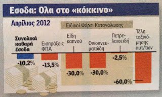 Σύμφωνα με πληροφορίες, τις πρώτες μέρες του Μαΐου καταγράφηκε σημαντική μείωση των εσόδων στις εφορίες που υπερβαίνει το 10% σε σύγκριση με το 2011. Όπως λένε αρμόδια στελέχη του υπουργείου Οικονομικών, ενώ πέρυσι τις πρώτες μέρες του Μαϊου οι ημερήσιες εισπράξεις των ΔΟΥ ήταν 40 εκατ. ευρώ, φέτος έπεσαν στα 35 εκατ. ευρώ και από τη Δευτέρα, την επόμενη των εκλογών, ο ρυθμός μειώθηκε ακόμη περισσότερο.