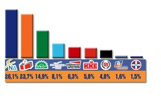 Έδαφος σε σχέση με τον στόχο του 3% για είσοδο στη Βουλή φαίνεται να χάνουν τόσο η ΔΗΣΥ της Ντόρας Μπακογιάννη όσο και ο ΛΑΟΣ του Γιώργου Καρατζαφέρη, καθώς συγκεντρώνουν το 1,6% και το 1,5% αντιστοίχως.