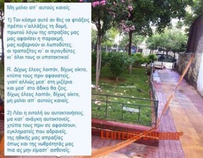 Μια μέρα πριν το άλμα στο κενό, ο 60χρονος άνδρας είχε αποκαλύψει την προσωπική του τραγωδία στη μουσική ιστοσελίδα στίχων stixoi.info όπου με μια επιστολή και λίγους στίχους όλο νόημα είχε προειδοποιήσει ότι βρισκόταν ένα βήμα πριν την απονενοημένη πράξη.