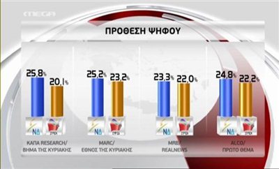 Το Πρώτο Θέμα δημοσιεύει δημοσκόπηση της ALCO με τη ΝΔ να συγκεντρώνει το 25,6%, ενώ ακολουθούν ο ΣΥΡΙΖΑ 22,9%, το ΠΑΣΟΚ 14%, οι Ανεξάρτητοι Έλληνες με 6,4%, το ΚΚΕ 5,6%, η Χρυσή Αυγή με 4,6% και η ΔΗΜΑΡ 4,6%.