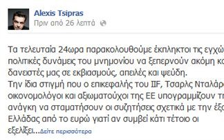 Αναλυτικά η δήλωση του κ. Τσίπρα έχει ως εξής: «Τα τελευταία 24ωρα παρακολουθούμε έκπληκτοι τις εγχώριες πολιτικές δυνάμεις του μνημονίου να ξεπερνούν ακόμη και τους δανειστές μας σε εκβιασμούς, απειλές και ψεύδη.